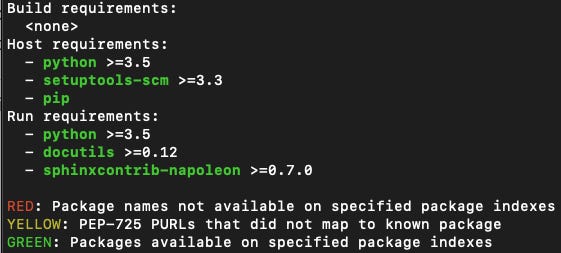 conda-forge, see the--packages-indexargument). You will need to create recipes for these requirements before you can proceed.🟡 YELLOW: external dependencies specified as PEP-725 PURLs do not map to known package. Either the packages do not have a conda recipe (similar to (1) above), or grayskull could not map the Package URL (PURL) to a conda package. For the former, add a new conda recipe for that package first, and for the latter, it’s probably best to add an issue to grayskull. Fortunately, it is quite rare to use this feature.
